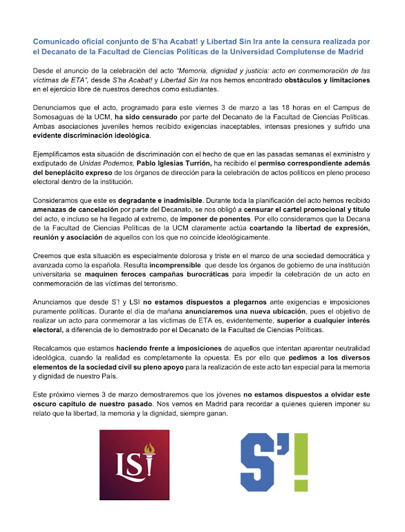 La facultad de Ciencias Políticas de la Universidad Complutense de Madrid, donde da clase Pablo Iglesias, ha censurado el acto en homenaje a las víctimas de ETA organizado por S’ha Acabat! y Libertad sin Ira este viernes 3 de marzo, según han denunciado ambas asociaciones.